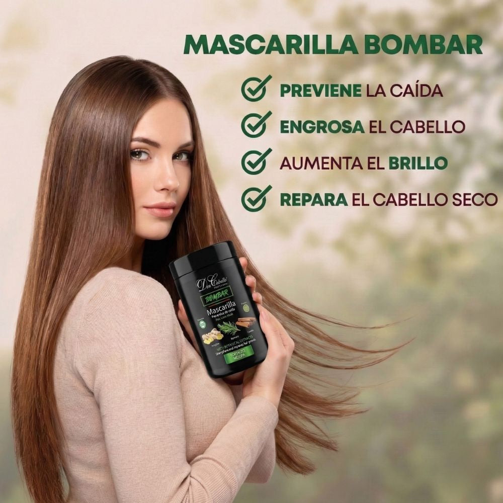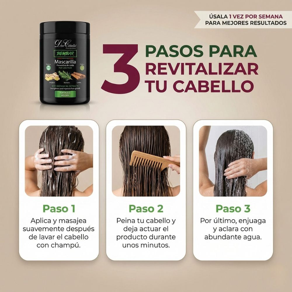 Esta mascarilla debe usarse durante tu régimen semanal de tratamiento capilar para lograr buenos resultados. El cabello húmedo y limpio siempre debe usarse después del champú siempre estos días, con un champú similar anticaída que la línea Bombar ha creado. Toma en grandes medidas, frota en el cuero cabelludo, en las raíces y puntas, y frota, para tomar una circulación viva. Deja reposar durante la noche y espera 10-15 minutos para asegurarte de que ha penetrado bien, para mejorar el tratamiento, coloca bajo un gorro de ducha o toalla. Ducha con mucha agua tibia.